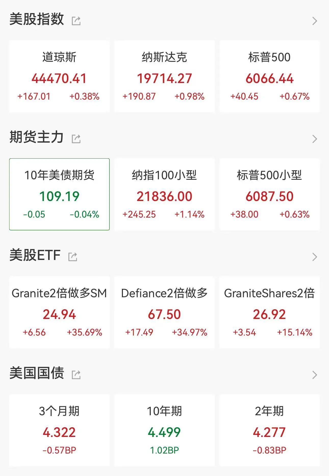 道琼斯工业平均指数上涨167.01点,涨幅0.38%,收于44,470.41点。美国标准普尔500指数上涨0.67%,收于6,066.44点,纳斯达克综合指数上涨0.98%,收于19,714.27点。