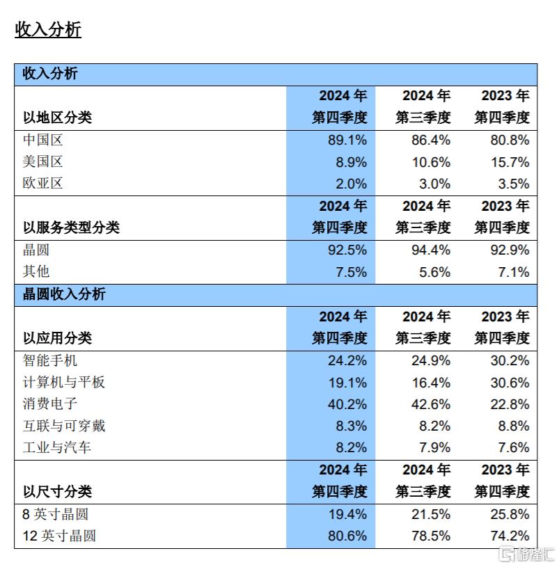 按来看,中芯国际去年四季度的收入占比分别为:智能手机24.2%、计算机与平板19.1%、消费电子40.2%、互联与可穿戴8.3%、工业与汽车8.2%。