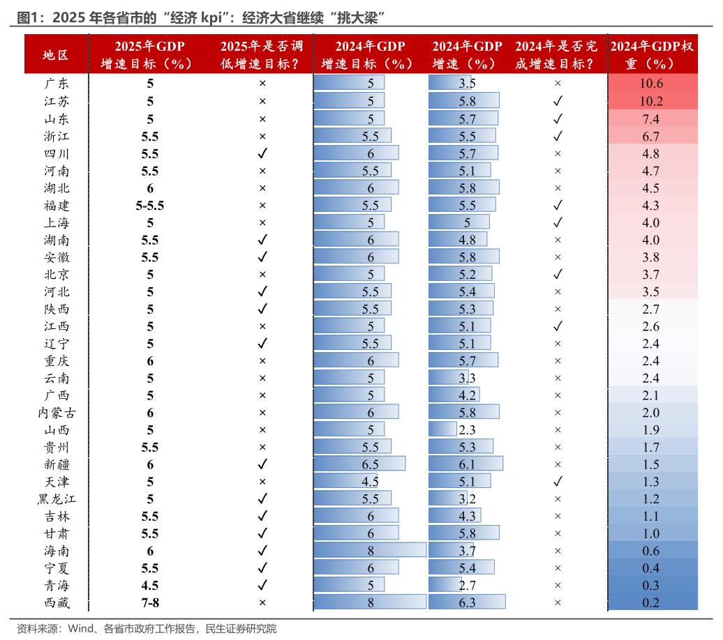 2025年“挑大梁”的重任仍在经济大省肩上。春节前各地已陆续召开地方两会,披露了各自2025年的“经济kpi”。从各省2025年的经济增长目标来看,经济占比靠前的前十个省市中,仅有两个调低了增速目标,而其余八个省市均维持增速目标不变(即便其中部分省市2024年实际经济增速不及预期),。