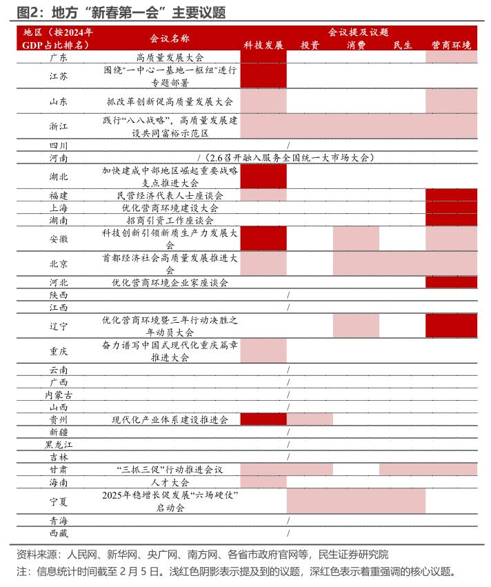今年的早春更加检验地方节后“发令枪”的成色,尤其是对于一季度的“开门红”。今年春节来得比较早,考虑到中央经济工作会议到地方政府部署之间间隔时间较短,节前地方对2025年工作的展开可能“心气足、时间不够”。节后各省市(尤其是一些经济大省)即刻召开了“新春第一会”,为2025年经济工作描绘出了更详实的画卷。