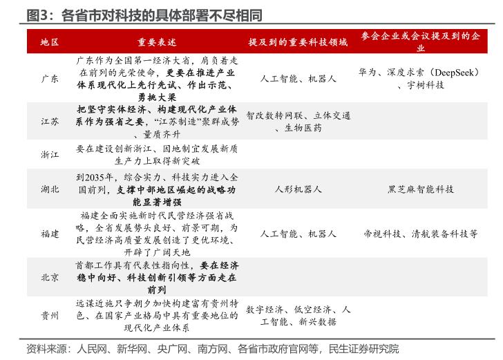 地方促科技:更讲究“因地制宜”。在开年首次会议上,广东、湖北等科技实力较强的省份提到的科技板块主要为人工智能、机器人;而拥有“中国数谷”美誉的贵州,更多是在数字经济、新兴数据上进行部署。