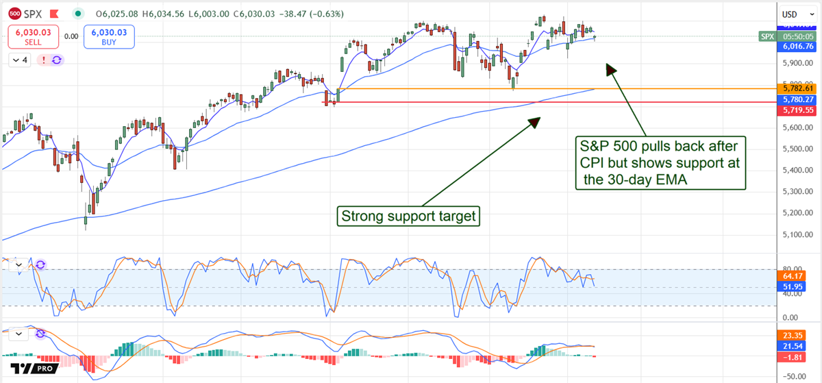 市场对通胀数据的反应在意料之中,标普500闻讯下跌。不过,交易者将早盘抛压视为布局良机,推动指数在30日均线获得支撑。如果该支撑位能守住,市场有望快速反弹并再创新高;若支撑失效,指数可能回落至5,960-5,790点区间寻求更强支撑,届时可能陷入年内震荡格局。