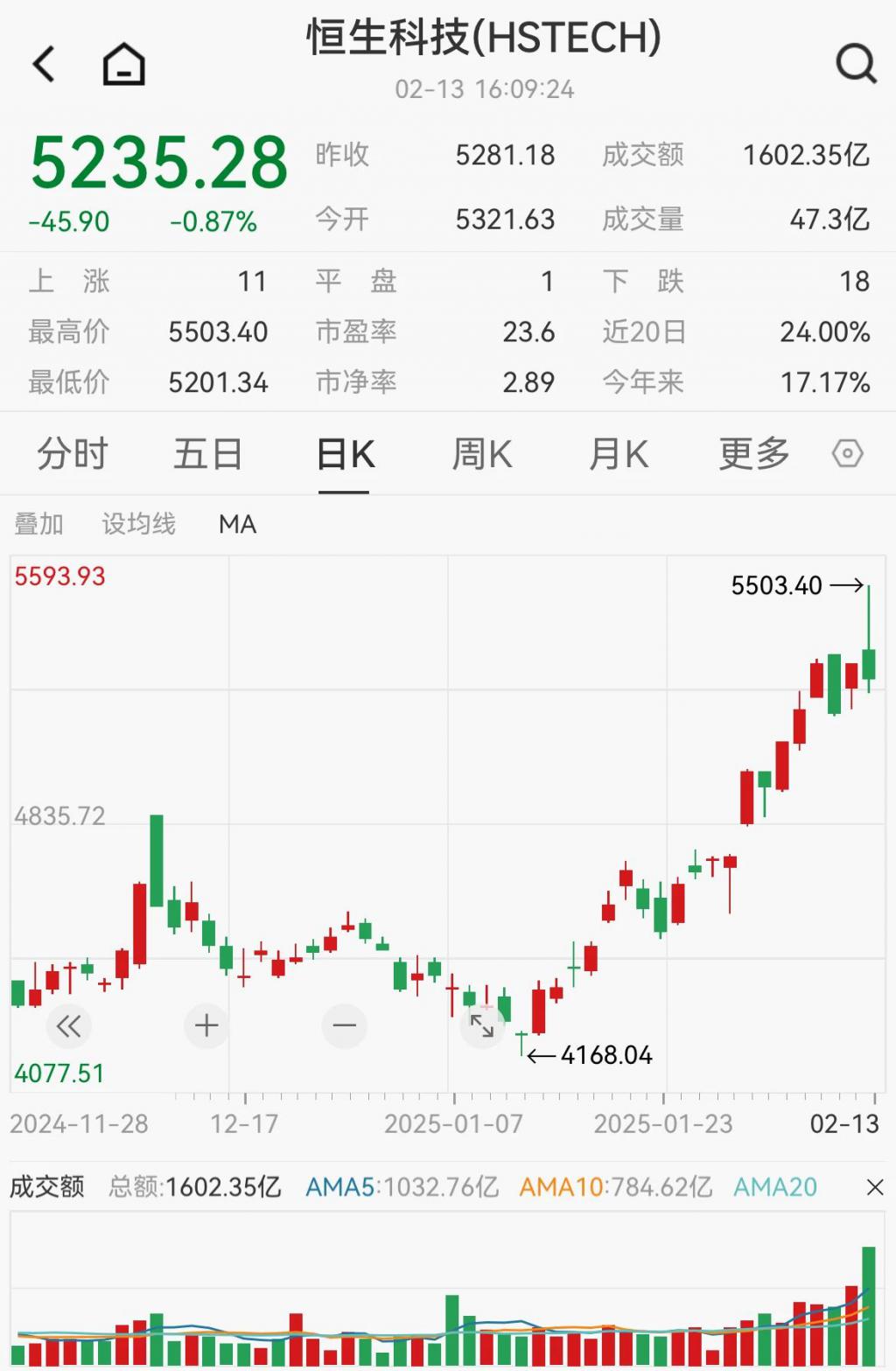 2 月 13 日,港股先涨后跌。恒生指数午后最高涨超 3%,随后震荡下行,最终收跌 0.2%,报 21814.37 点,未能站稳 22000 点。恒生科技指数盘中一度涨超 4%,随后自 3 年高点回落下跌 0.87%,最终报收 5235.28 点。