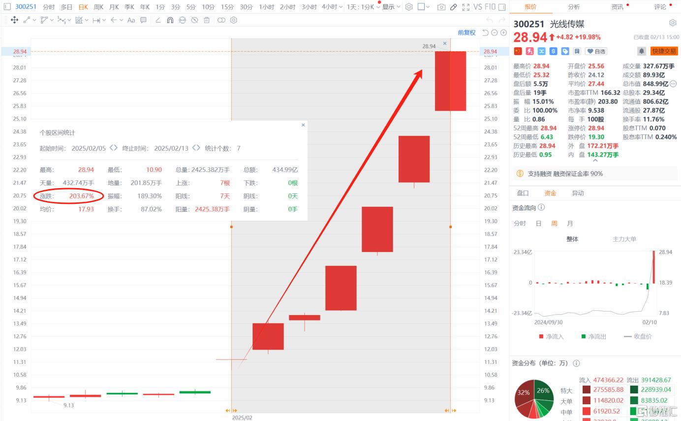 自2月5日以来,光线传媒股价疯狂暴涨。