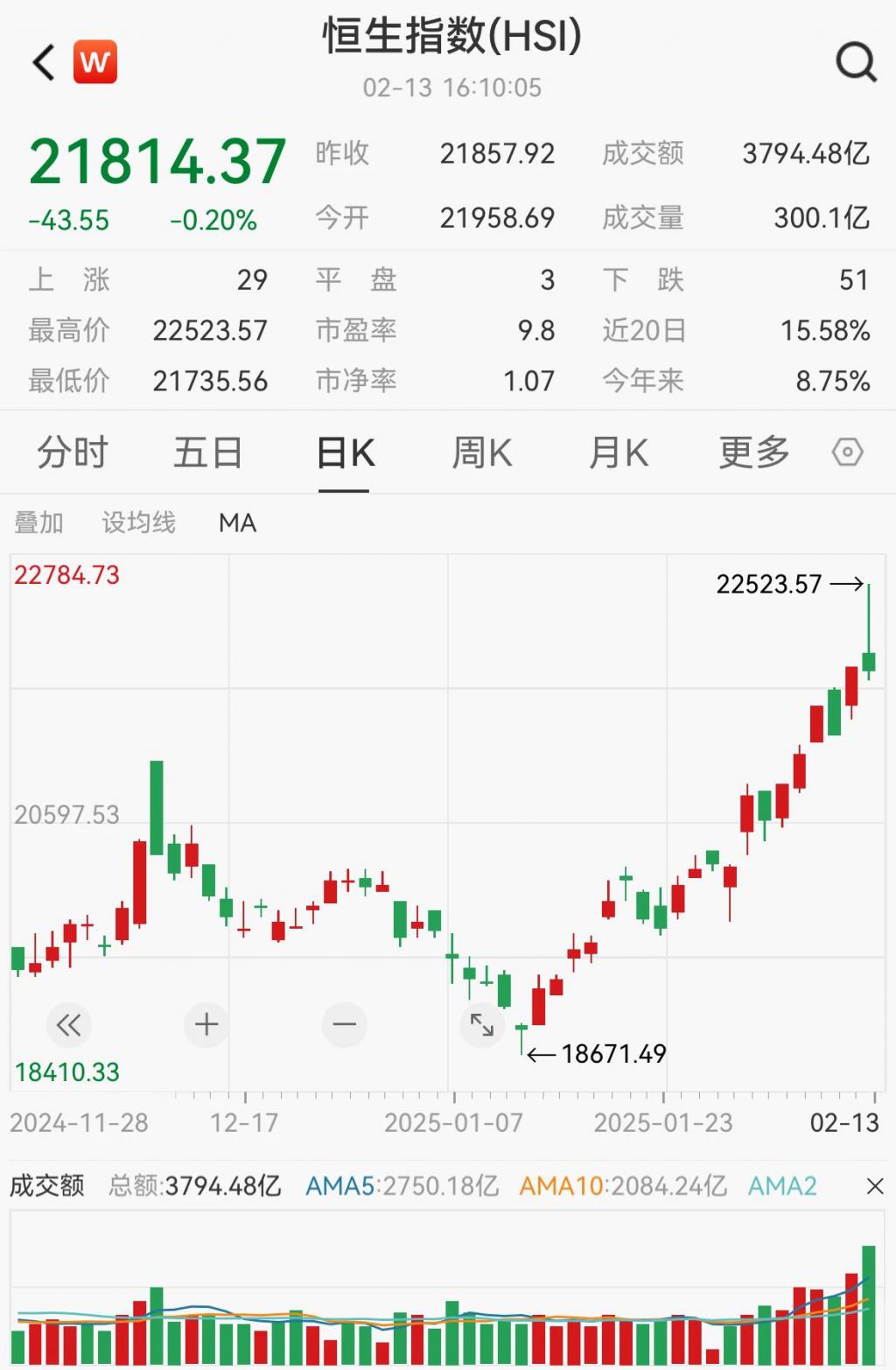 2 月 13 日,港股先涨后跌。恒生指数午后最高涨超 3%,随后震荡下行,最终收跌 0.2%,报 21814.37 点,未能站稳 22000 点。恒生科技指数盘中一度涨超 4%,随后自 3 年高点回落下跌 0.87%,最终报收 5235.28 点。
