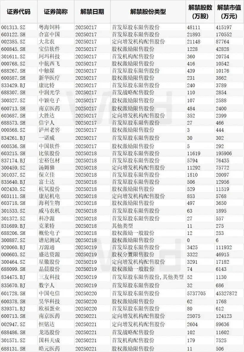 从解禁市值来看,2月20日是解禁高峰期,3家公司解禁市值合计4533.03亿元,占本周解禁规模的96.59%。按2月14日收盘价计算,解禁市值居前三位的是:中国电信(4532.79亿元)、粤海饲料(41.52亿元)、比依股份(19.59亿元)。从个股的解禁量看,解禁股数居前三位的是:中国电信(573.77亿股)、粤海饲料(4.81亿股)、南京医药(2.51亿股)。