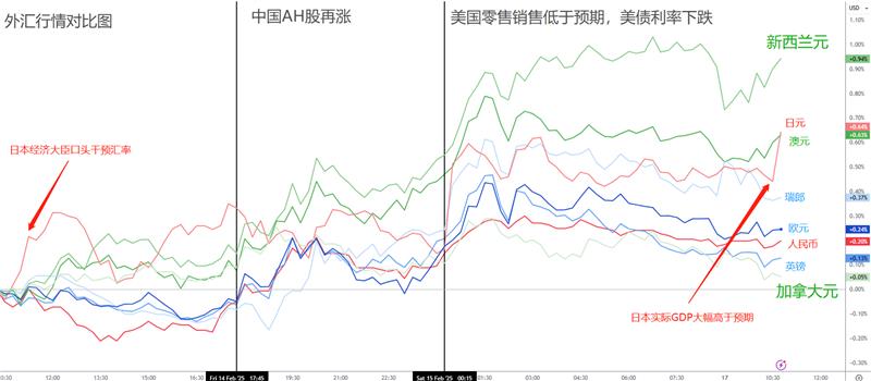 商品货币(澳元、纽元、加元):对等关税推迟的消息对中国与欧洲股市有利,因此在欧市盘前,两大指数同步大涨。连带澳元与纽元两大商品货币一同大涨,全天表现最佳。加元则如此前分析一样,由于2月初加拿大关税推迟的消息已经耗尽了加元上涨动能。因此上周五加元涨势不佳,表现反倒最差。