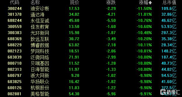 泛微网络、日海智能、贝瑞基因、浙大网新、华扬联众等午后纷纷跌停。此外,迪安诊断、永信至诚、佳发教育、博睿数据等多股跌超10%。