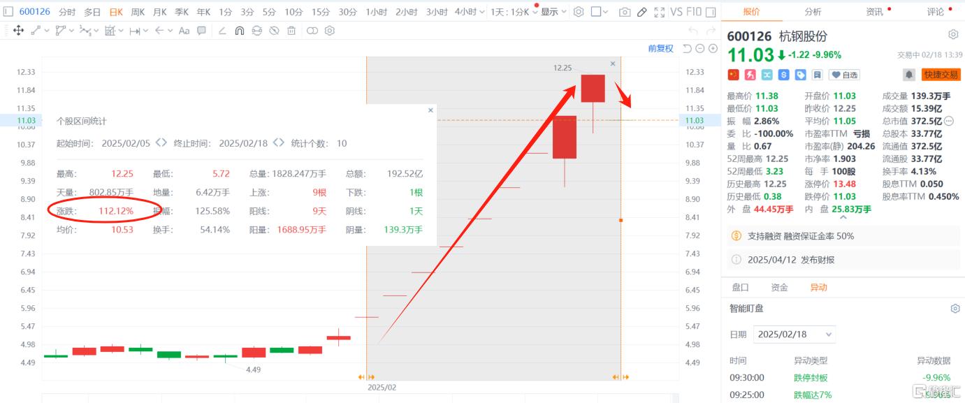 自2月5日蛇年开市以来,受Deepseek热潮推动,杭钢股份 (SS:600126)登上了连板天梯,