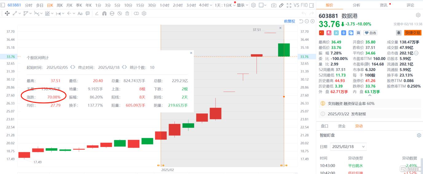 今日,数据港 (SS:603881)也在斩获了6天5板后闪崩。2月5日至今,股价累计涨幅超70%,总市值202.1亿元。