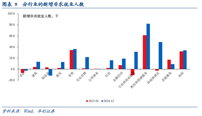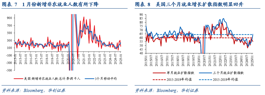 月份,美国新增非农就业低于预期,但其中或有寒冷天气(可能影响休闲酒店业的就业)、俄勒冈州医疗罢工、南加州山火带来的短暂负面冲击的影响。由于前两个月非农就业明显上修,最近三个月平均新增就业达到23.7