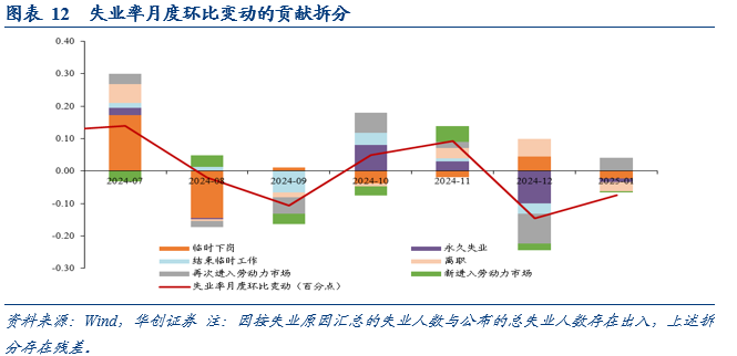企业裁员持平、临时下岗人数下降是拉动失业率下行的主因,分别带动失业率下行约0.03、0.02、0.01个百分点,再次进入劳动力市场的人数增加,带动失业率上行约0.04个百分点。