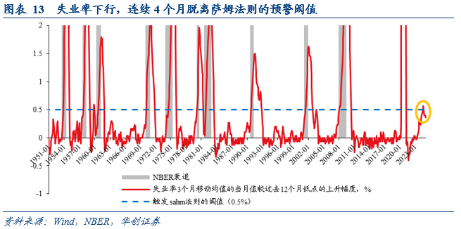 失业率的3个月移动平均值较过去12个月低点高出0.37个百分点,低于萨姆法则的预警阈值(0.5个百分点)。