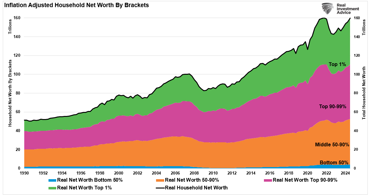 这一点非常关键。美联储依靠消费者信心来推动经济活动,并期望通过提高资产价格来达到这一目的。然而,尽管资产价格有所上涨,但经济底层90%的人群在消费方面却难以实现增长,因为他们在“经济财富”中的占比并未实质性提升。我们此前就指出: