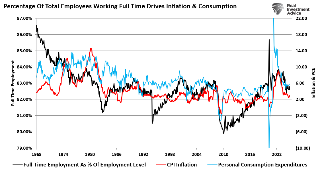 数据也支持了这一观点。全职就业在当前就业水平中所占比例下降,与个人消费支出的疲软有着密切关联。如果商品和服务的需求下降,通胀也会随之降低。