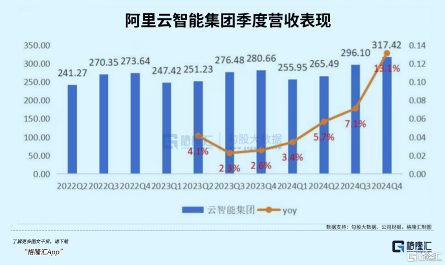尤其是,市场认知逻辑正从将阿里AI能力视为“成本中心”向“利润引擎”转变的关键过程中,阿里云最先体现出这一变化。据阿里财报,25财年第三季度,阿里云录得营收317.42亿元,同比增长13%,这一数据较24年和23财年的同期增速都明显高出不少。