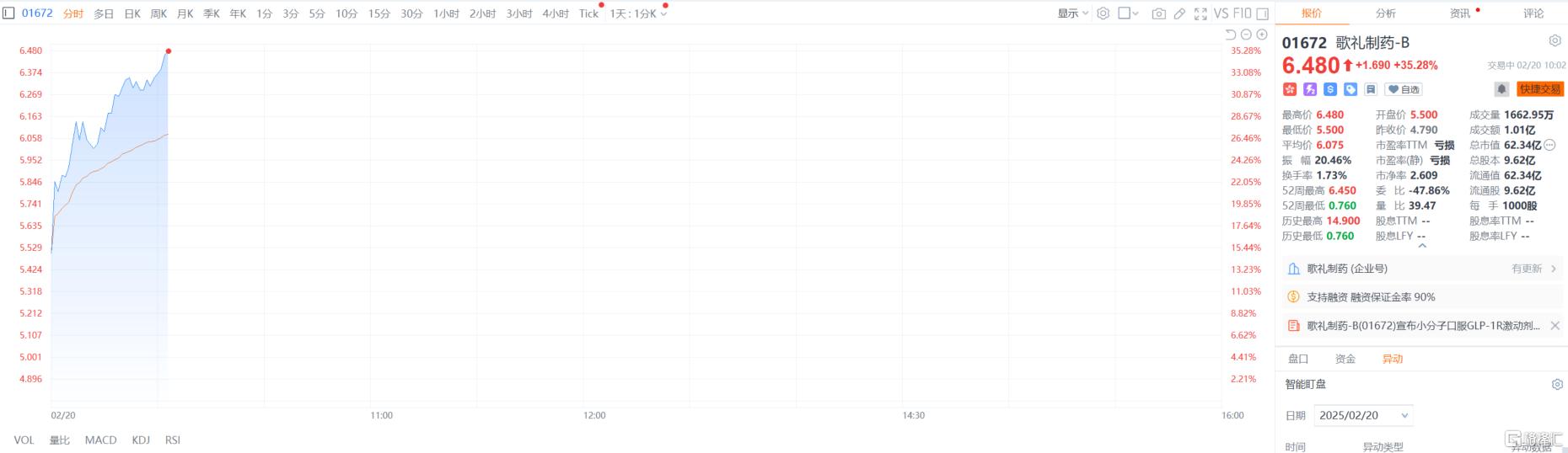 今日开盘,歌礼制药股价快速拉升,截至发稿,公司股价飙涨35%,最新报6.47港元/股,总市值62.05亿港元。