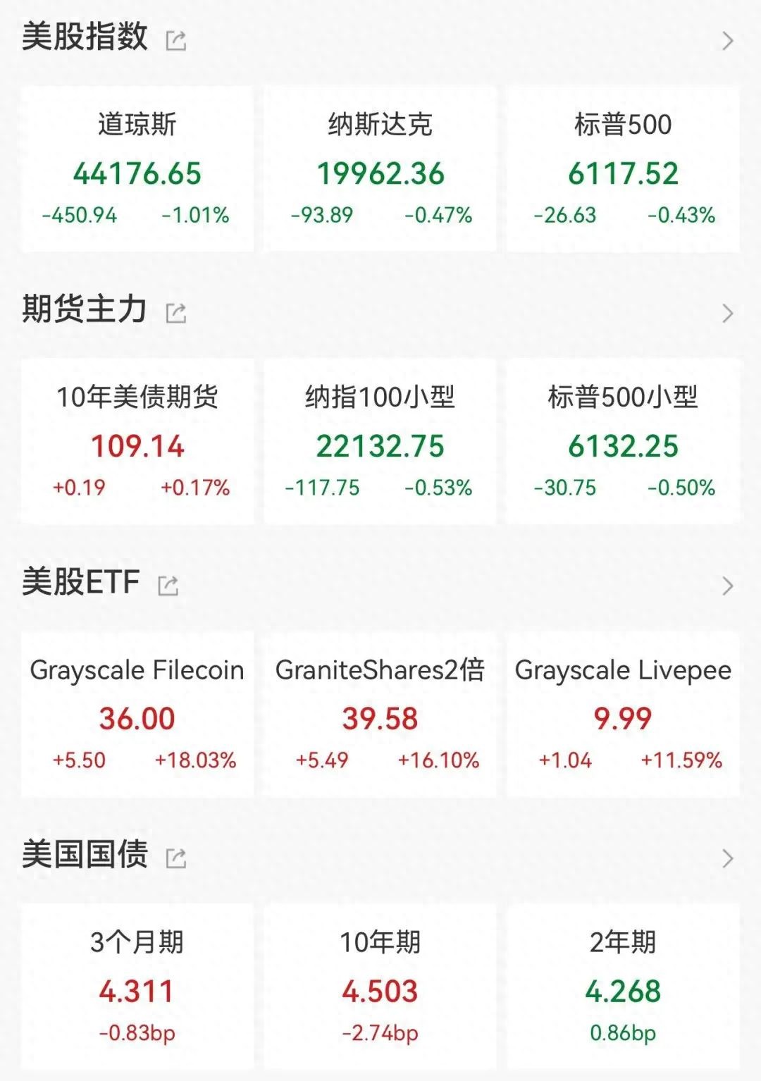 道琼斯工业平均指数下跌450.94点,收于44176.65点,跌幅1.01%。美国标准普尔500指数下跌0.43%,收于6,117.52点,纳斯达克综合指数下跌0.47%,收于19,962.36点。