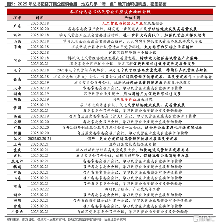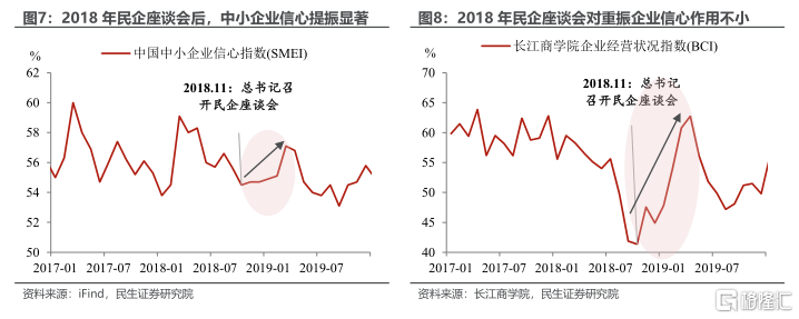 民企座谈会结束,但政策还在继续发酵。这一次民企座谈会可谓是“牵一发而动全身”,科技创新政策从由私营企业主导的“自下而上”式、逐步切换为由中央主导的“自上而下”式,这也意味着座谈会结束后,还会伴随着部委和地方响应、出台政策措施、落实政策措施等传导链条。从2018年的经验来看,民企座谈会将为中小企业信心指数、企业经营状况指数等衡量微观主体活跃度的指标打开近半年的上行通道,也就是说民企座谈会的“余温”有望维持至少半年时间。
