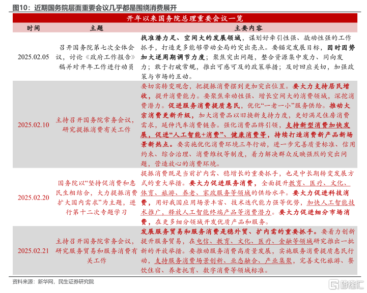 科技有了,那消费呢?总量政策的诉求虽然在降低,但从近期国务院召开会议内容来看,消费这个“后手棋”已经备好——国务院全体会议于年后首个工作日提出的“找准潜力足、空间大的发展领域”,实则就是消费(这从近两周国务院层面的重要会议“清一色”在讨论消费中可见一斑);而“因时因势加大逆周期调节力度”,意味着后续经济下行压力较大之际,消费才会择机出台。除了“惠民生”的教育、医疗、养老等,刺激消费政策还开始强调科技消费、新型消费(如“人工智能+消费”),这也将成为未来消费的一大亮点。