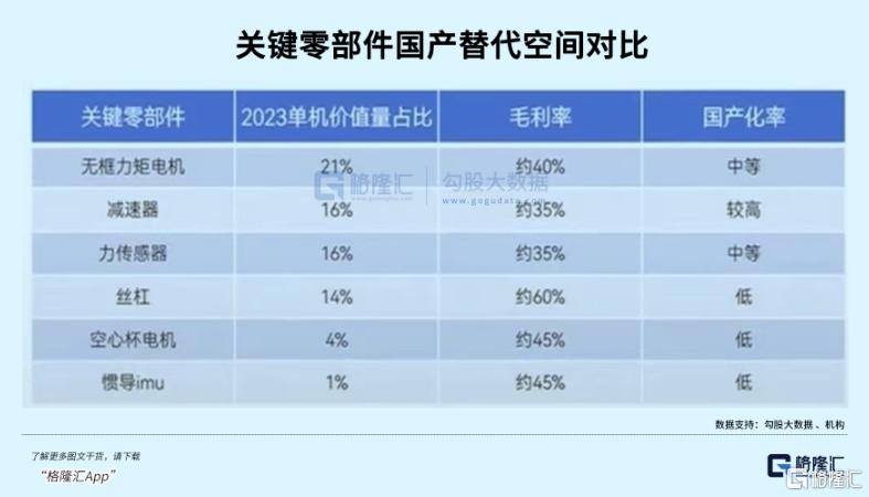 不管用那种技术方案,丝杠在人形机器人当中均为一种核心零部件,技术壁垒最高(毛利率高达60%,高于电机、减速器、力传感器等),国产化率低,单机占比较大。因此,资本市场追捧丝杠相关核心龙头,尤其必然性与逻辑性。