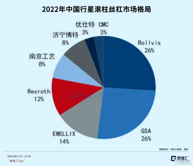 在行星滚柱丝杠领域,海外厂家主要为瑞士GAS、瑞典ROLLVIS,两家占据全球50%的市场份额,其余玩家还包括斯凯孚、美国GMS、日本NSK和THK。在中国市场,主要还包括台湾的上银科技,其他企业大多处于中低端市场。
