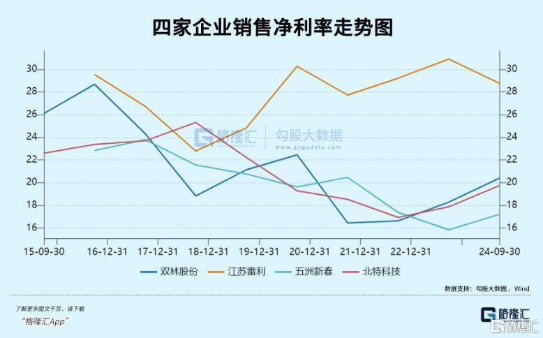 可见,四家企业的营收、利润均没能够保持较好增长。其中,双林股份2024年营收、净利润变动很大,主要系新能源汽车电驱动系统加速上量,而传统业务座椅部件、轮毂轴承则保持相对平稳。江苏雷利、五洲新春营收增长不算慢,但净利润相较营收表现更差,主要系净利润率在这些年持续波折下滑。