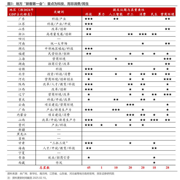 今年一季度宏观和资本市场层面的“科技至上”与去年似曾相识。尤其是随着DeepSeek和《哪吒2》的,科技的“含金量”在一季度拼经济中的成色更显十足。我们此前的报告表明,相对于消费,“锚定科技”在地方“新春第一会”中的信号更为明确。