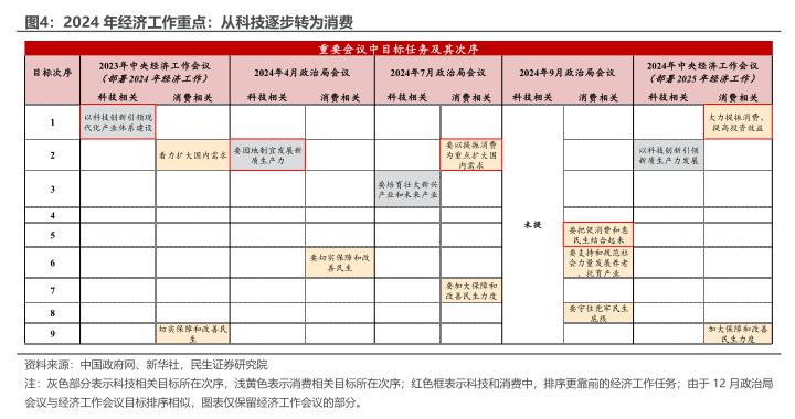 回首2024年,年初政策更重视供给端,需求端的刺激到年中才跟进。2024年4月政治局会议再次重申了“新质生产力”的重要性,但7月会议开始将“提振消费”置于“壮大新兴产业和未来产业”之前,9月也并未对科技创新进行强调,包括7月国常会将特别国债资金从原本的“两重”拓展到“两新”,其实也与这一政策脉络不谋而合。