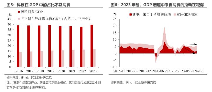 2024年“消费大于科技”的内外经济条件。2024年外部不确定性相对更小一些,此时可以更加重视内部经济的修复。想要稳增长,“促消费”的性价比要高于“促科技”。作为“三驾马车”之一,消费在GDP中的占比更高,能更好地起到“四两拨千斤”的作用。同时,2023年以来经济增长中来自于消费的拉动逐步下滑,有效需求不足是经济运行的主要矛盾,“量体裁衣”才能更好地提振经济。