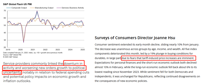 然而行情的发展在美市开盘后更加出乎意料。美国接连发布了2月服务业PMI、密歇根大学消费者信心以及美国成屋销售情况,不仅远远低于预期/初值,还创下近年来最低水平。尤其是服务业PMI直接从连个月前的56.8,直接跌穿荣枯线至49.7,大大出乎市场的意料。按照特朗普的习惯,肯定会甩锅给拜登,称这是“拜登衰退”。但其实PMI和消费者信心都是属于预期型数据,就是受访者对未来经济的看法。从PMI报告来看,服务业提供商下调预期的原因正是因为特朗普政策的不确定性,正因关税政策迟迟未落地,企业不敢轻易扩张需求。而消费者信心大降同样与关税恐惧有关。受此影响,美股大幅度崩盘。