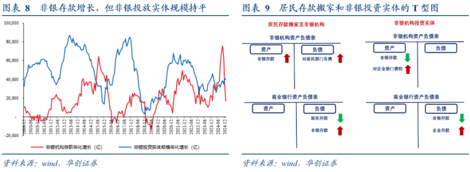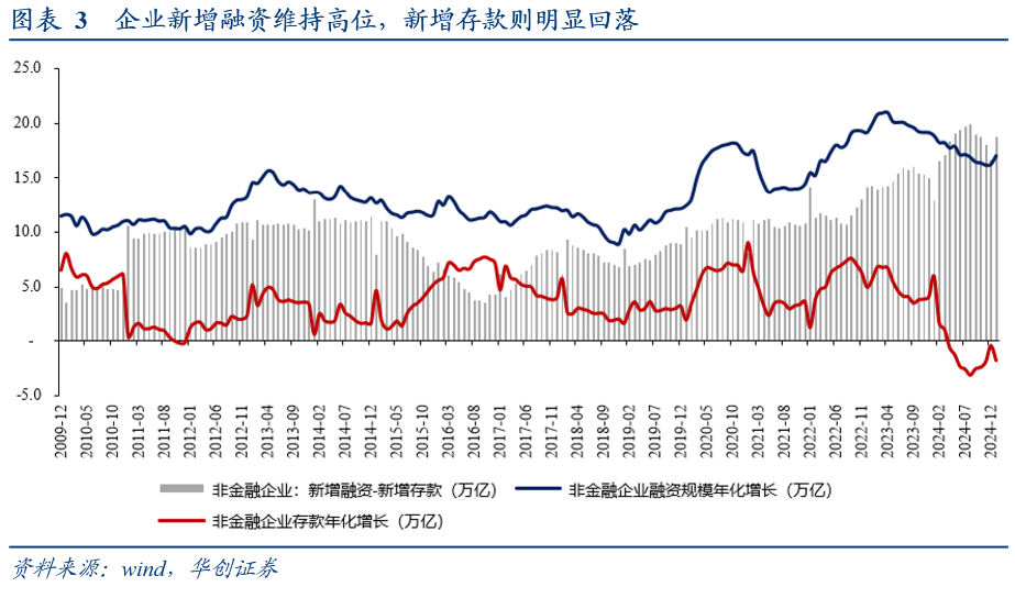 。数据来看,2024年,企业各项融资规模(用新增社融减去政府债融资和居民贷款)16.2万亿,处于2008年以来的76%的历史分位数,而企业新增存款规模为-0.4万亿,是2008年以来5%的历史分位数。两者差距(新增融资-新增存款)规模16.6万亿,处于2008年以来94%的历史分位数,近乎历史最高值。