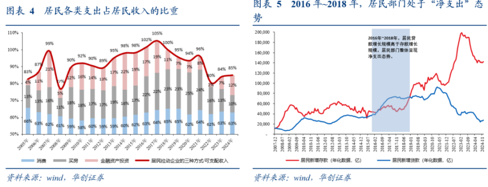 2016年~2019年,居民各项支出占收入的比重均值约为101%,对应彼时居民贷款新增规模大于存款新增规模,居民处于净支出状态;2023年~2024年,居民各项支出占收入比重均值85%左右,对应居民部门的新增存款是新增贷款的4.4倍,居民部门处于净收入态势。拆分细项来看,与2016年~2019年相比,2023年~2024年,居民各项支出占收入比重回落16%,其中消费行为占收入比重回落1.2%左右,投资行为占收入比重回落14.8%左右。