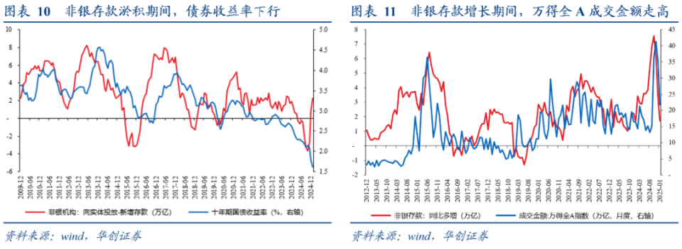 结合我们前期报告《货币政策的“伺机而动”》来看,2024年货币运行的一个重要叙事在于,由于存款利率持续下行,居民的存款开始“搬家”至非银机构,但由于非银机构对实体经济投资意愿不足,资金淤积在金融体系形成非银存款,由此一方面推动了债券收益率的下行,另一方面带动了股票市场的成交金额的走高。