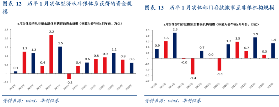 。1月数据来看,与此前春节在1月的五个年份(2012、2014、2017、2020年,2023年),2025年1月企业存款回落幅度相对偏小,但居民新增存款规模仍然维持高位。我们提示1月存款数据通常收到过年因素扰动,。