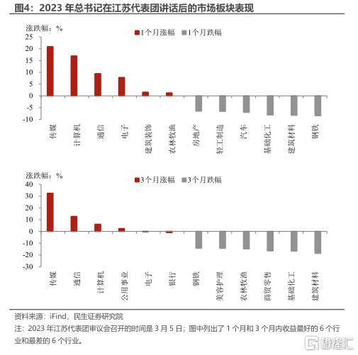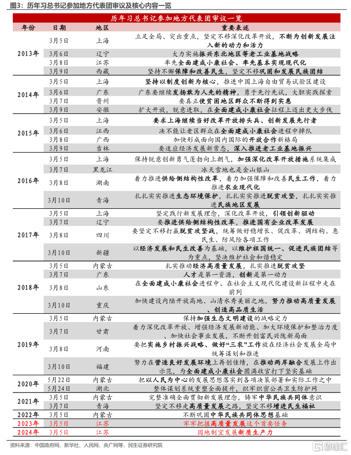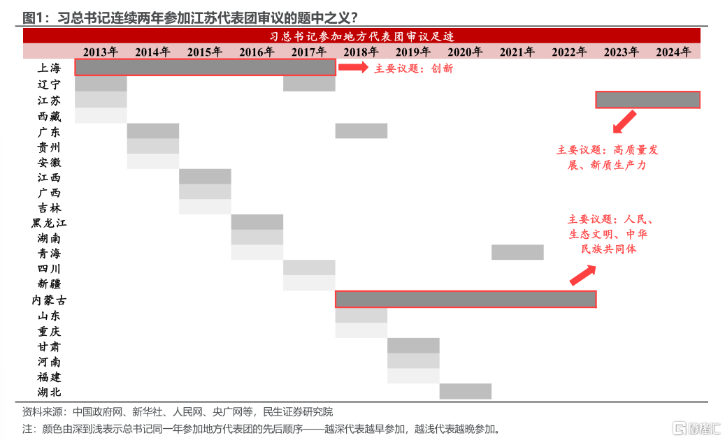 首先需要关注的,是总书记地方代表团的审议讲话,其传达出的政策脉络“清晰度”不仅更高,也更能定调两会后的“优先事项”。比起《政府工作报告》对经济工作部署的“全面铺开”,两会期间总书记参加地方代表团审议会更多是“开门见山”、直击主题,这一主题不仅是部署了该地区这一年经济工作的重点,甚至是定调了未来几年全国经济发展的“抓手”。
