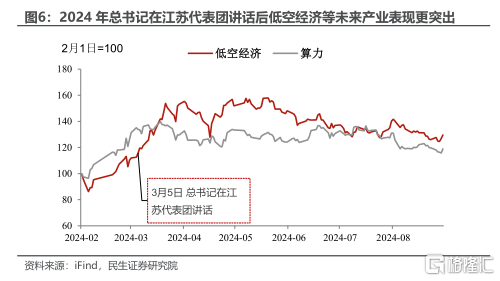 2024年:“因地制宜发展新质生产力”。2024年在经济“开门红”的背景下,总书记3月在江苏代表团的讲话,主要聚焦了两个方面:一方面,面对新一轮科技和产业革命,要“培育壮大新兴产业,超前布局建设未来产业”;另一方面,强调发展新质生产力“要防止一哄而上、泡沫化,也不要搞一种模式”。