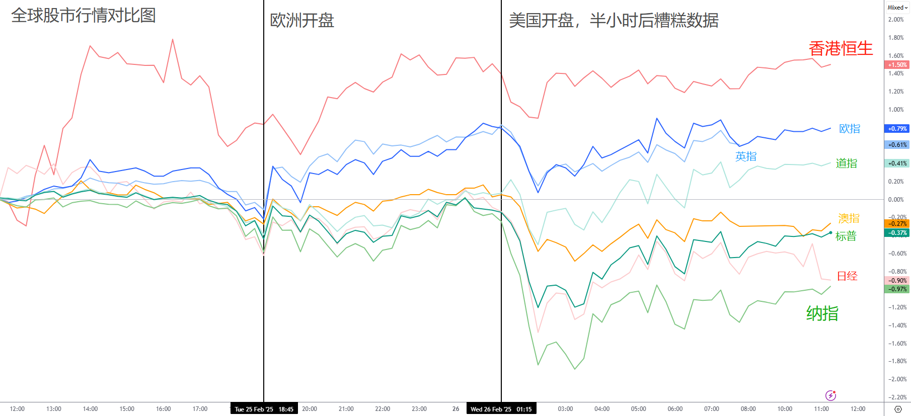 需要明确的是,美股的下跌并非由数据直接引发。美股开盘半小时后,咨商会消费者信心指数跌破100,创下10个月新低;达拉斯服务业指数同样疲软,与上周五的经济数据走势一致,显示美国经济正受到政策不确定性的冲击。但值得注意的是,美股下跌早在开盘时便已开始,数据发布只是进一步加剧了跌势。