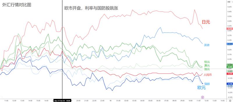 市场判断,这次峰会很有可能就是欧盟想办法如何应对俄罗斯的威胁,很可能会发行欧洲联合债券以提高国防支出(会导致利率上涨)。因此在峰会之前,市场便开始了行动。除了上述的欧债利率开盘跳涨外,欧洲国防股例如莱茵金属等股票价格同样开盘暴涨。不过欧元与瑞郎非但没有跟随利率上涨,反而遭到抛售,开盘持续下滑。