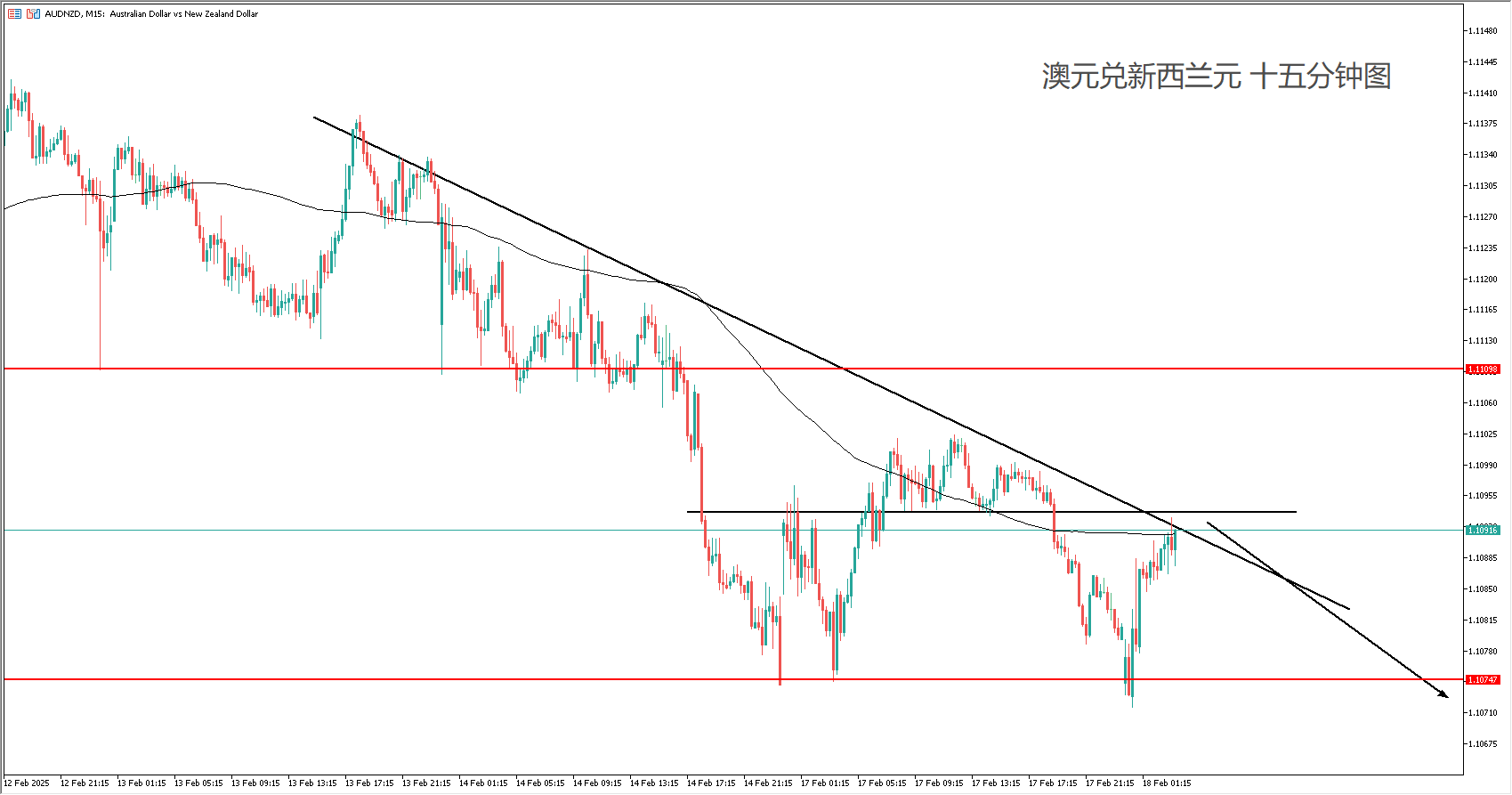 技术面: 100均线微微向下,澳纽在1.1075关口获得支撑,但下降趋势线同样完整。考虑到利率决议容易让汇率出现超短线剧烈波动。交易策略应该以回踩高位后分批做空为主。
