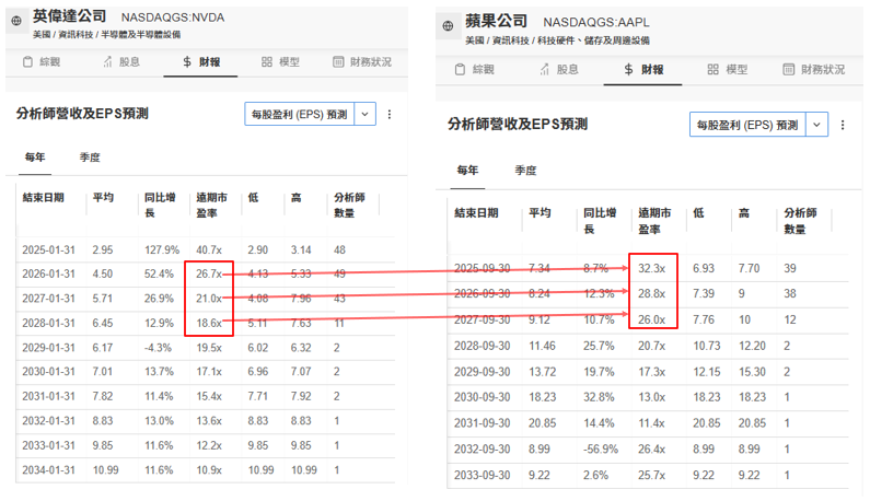 英伟达vs苹果公司未来三个财年的远期市盈率