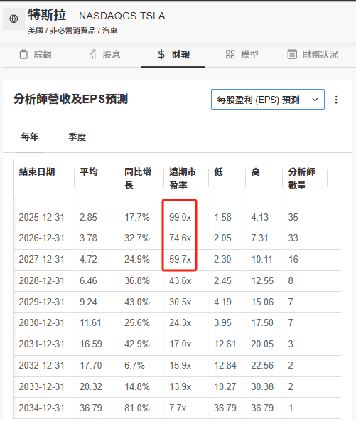 特斯拉未来三个财年的远期市盈率,来源:InvestingPro
