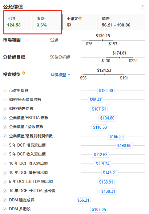 英伟达的其他估值:模型认为股价已达公允水平当然,估值方法有很多种。在远期市盈率外,InvestingPro根据14种模型综合得出的英伟达估值是124.53美元,相比现价120.15美元,属于估值合理的公允水平。