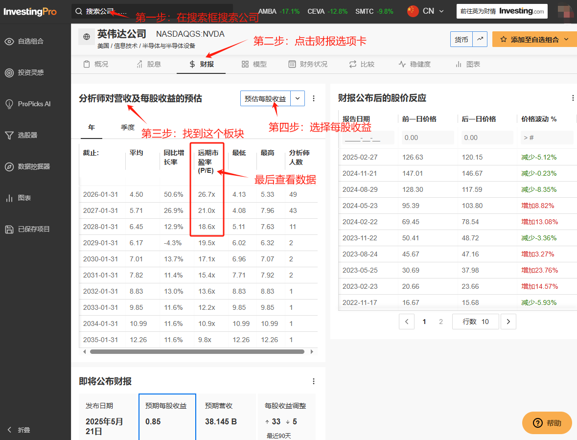 如何查看英伟达远期市盈率?上文列出的英伟达、特斯拉的远期市盈率数据来自英为财情Investing.com旗下美股工具InvestingPro。