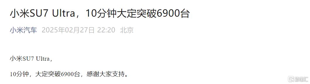 在发布会结束后不久,小米汽车便发来战报:小米SU7 Ultra10分钟,大定突破了6900台。