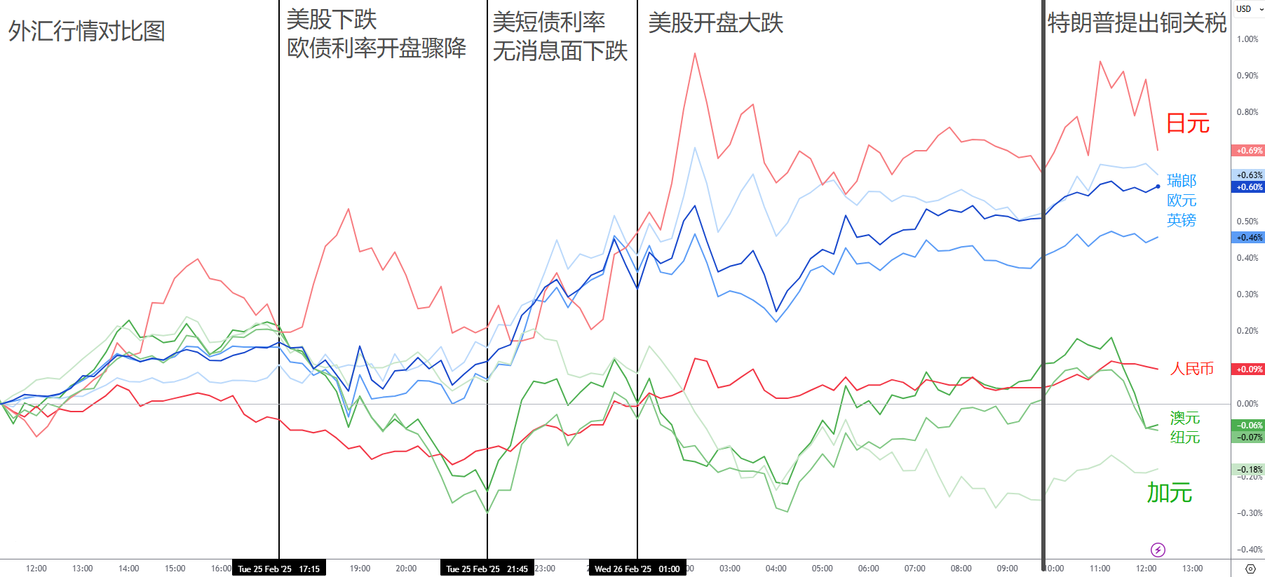 美国股市开盘大跌,连带全球股市、大宗商品、商品货币、币圈等多数价格一同下跌,唯独日元再次表现强劲,不愧是美股的最佳避险货币。特朗普新增关税目标,铜瞬间获得“转移”需求,价格暴涨。
