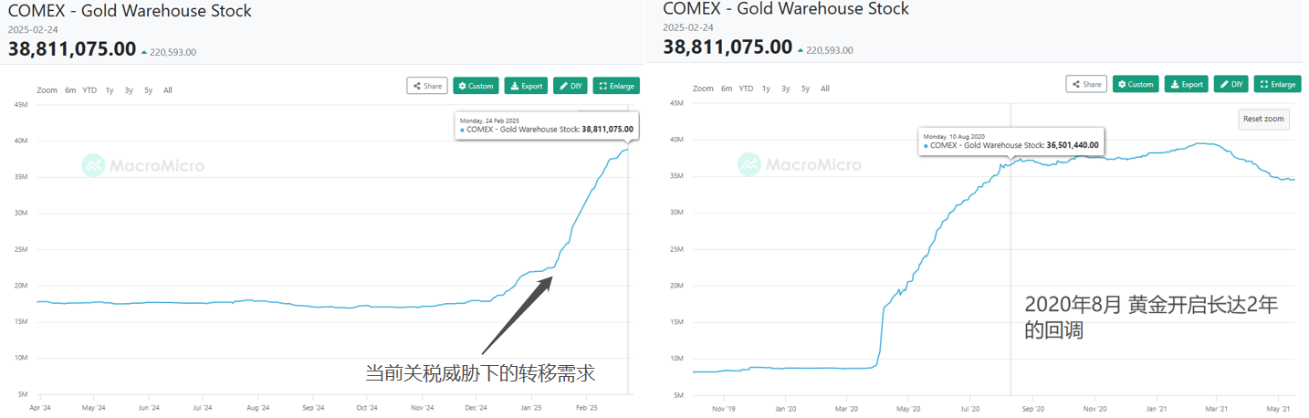 最新数据显示,纽约Comex黄金库存增长速度显著放缓,黄金的反常“关税转移”需求可能接近尾声。就像2020年8月新冠疫情期间一样,