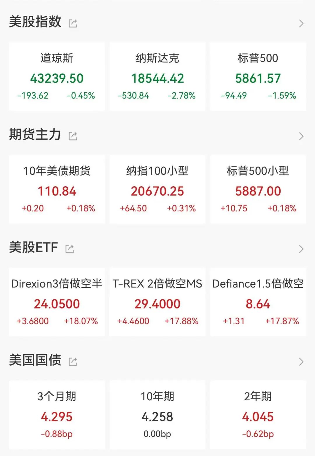 美国标准普尔500指数最终下跌了1.59%,报收于5861.57点。该指数本周和本月依然处于下跌状态。纳斯达克综合指数下跌了2.78%,收于18544.42点,其中英伟达股价下跌了8.5%,进一步拖累了科技股集中的纳斯达克指数。道琼斯工业平均指数下跌了193.62点,跌幅为0.45%,收于43239.50点。