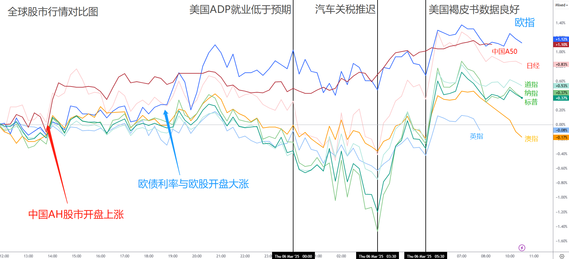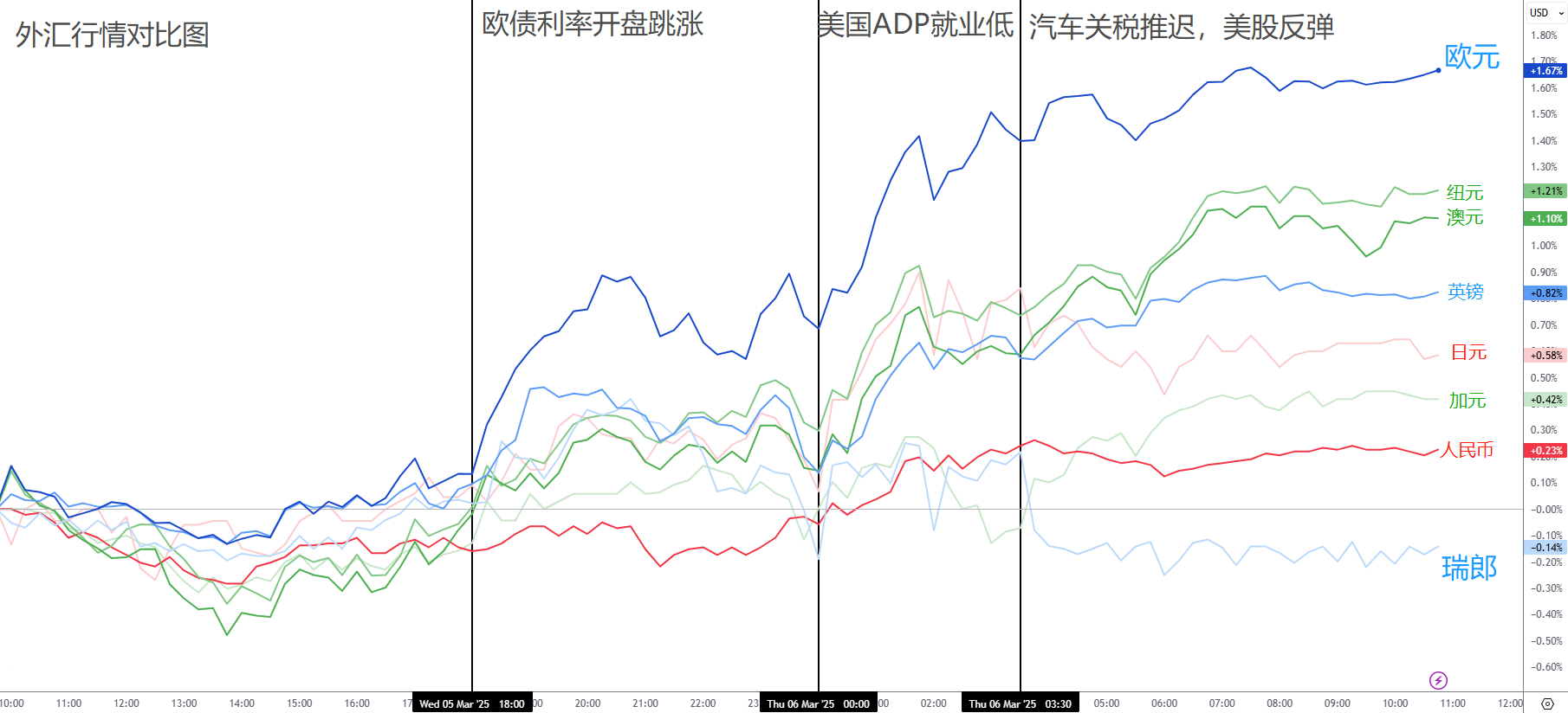 前一天提到的关税折中方案来了,特朗普推迟汽车关税一个月。然而加拿大并不满意,美元也停止下跌。全球股市倒是受到激励,集体回暖。在欧盟天量军备计划之下,欧洲国债利率罕见飙升,欧元与欧股一同大涨表现最佳!