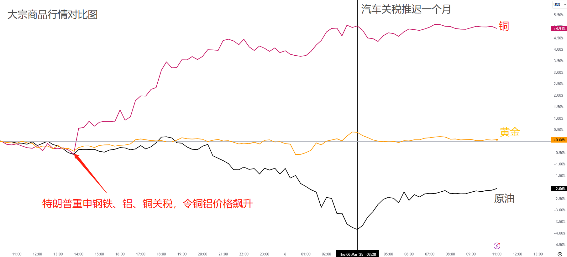 大宗商品走势分化明显。昨日亚盘盘中,特朗普在国会联席会上的讲话中,重申了钢铁、铜和铝的25%关税,“关税转移”需求令铜铝价格瞬间暴涨,全天保持涨势。原油则保持强势空头,走势与美股相近。在关税推迟消息后,油价触底反弹,但动能不足。黄金则保持水平震荡。